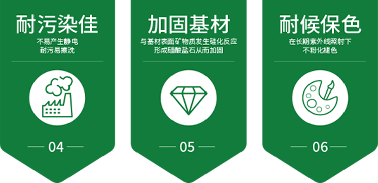 弗克風(fēng)?涂料采用納米二氧化硅作為膠凝物質(zhì),并根據(jù)應(yīng)用需要,采用自主工藝對(duì)硅酸鹽材料進(jìn)行改性,弗克風(fēng)技術(shù)成功攻克傳統(tǒng)無(wú)機(jī)涂料穩(wěn)定性差、易泛堿、難調(diào)色的難題,發(fā)明出擁有國(guó)家發(fā)明專利技術(shù)的弗克風(fēng)硅質(zhì)漆。